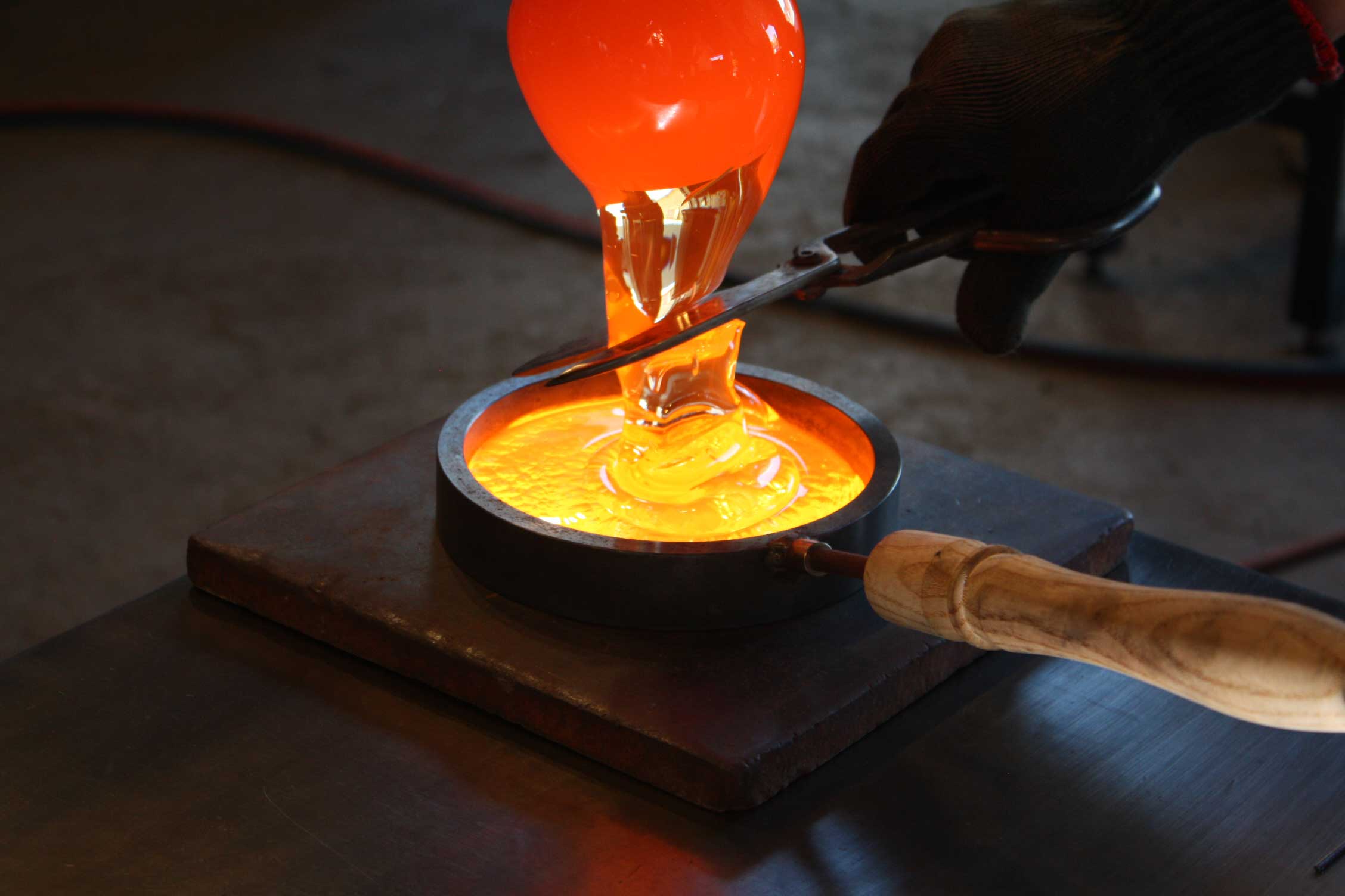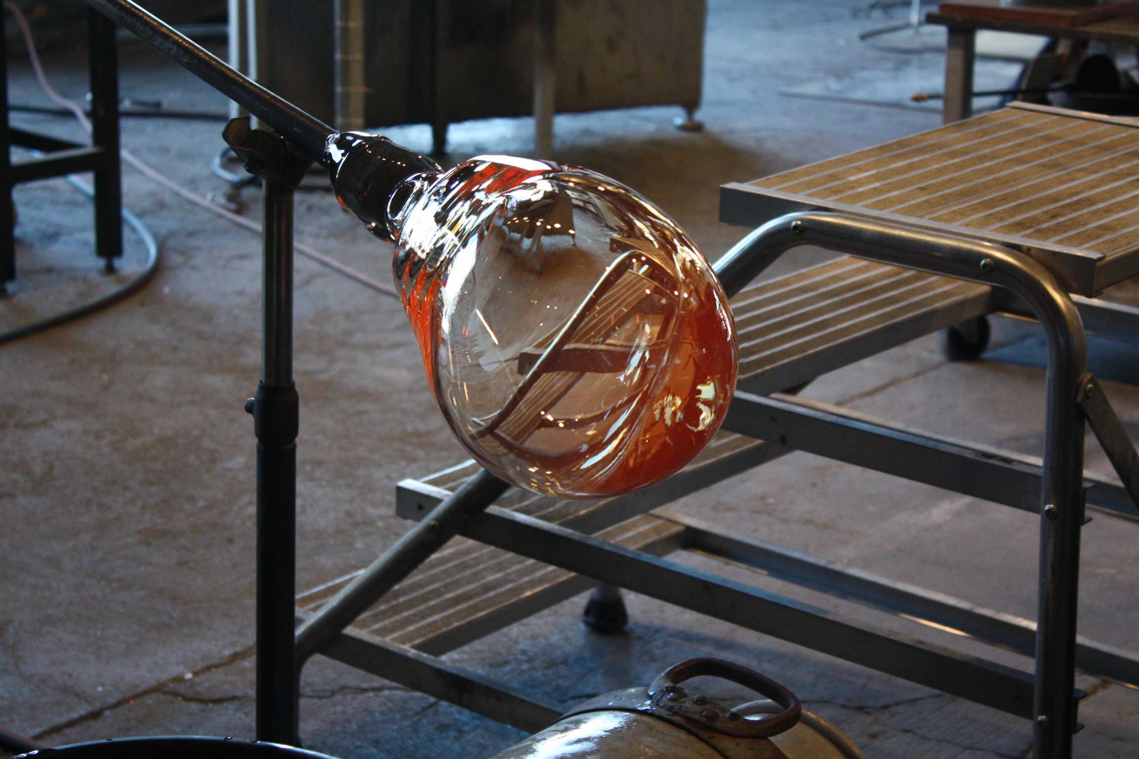 The action in the workshop is like fluid farming in an industrial sand box. It is three glassblowers moving as if siblings or one very very confident body. Hands, arms, feet move effortlessly accurate, perfectly timed and coordinated. Hands that handle hot without waisting energy on words.